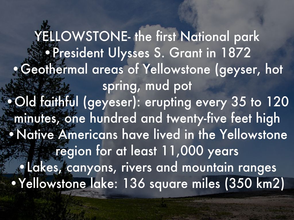 YELLOWSTONE- the first National park •President Ulysses S. Grant in 1872 •Geothermal areas of Yellowstone (geyser, hot spring, mud pot •Old faithful (geyeser): erupting every 35 to 120 minutes, one hundred and twenty-five feet high •Native Americans have lived in the Yellowstone region for at least 11,000 years •Lakes, canyons, rivers and mountain ranges •Yellowstone lake: 136 square miles (350 km2)