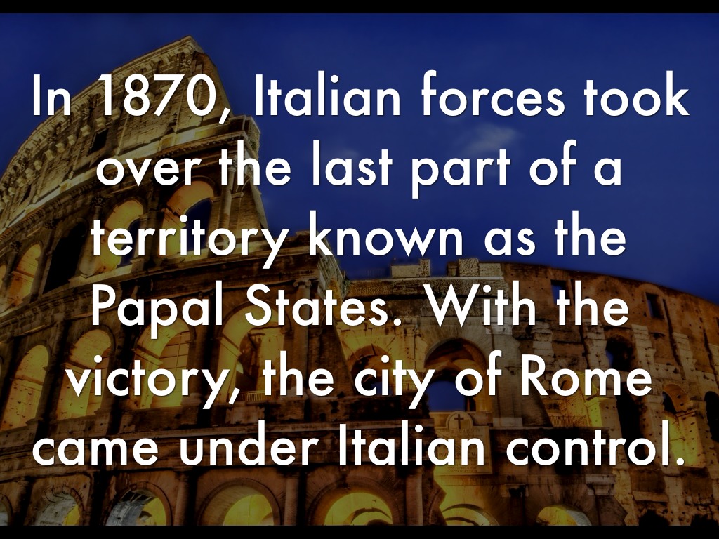 In 1870, Italian forces took over the last part of a territory known as the Papal States. With the victory, the city of Rome came under Italian control.