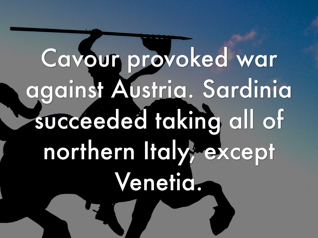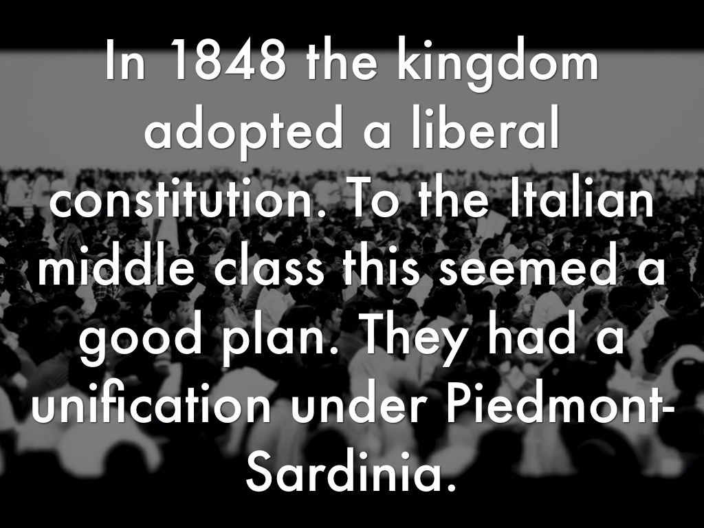 In 1848 the kingdom adopted a liberal constitution. To the Italian middle class this seemed a good plan. They had a unification under Piedmont-Sardinia.
