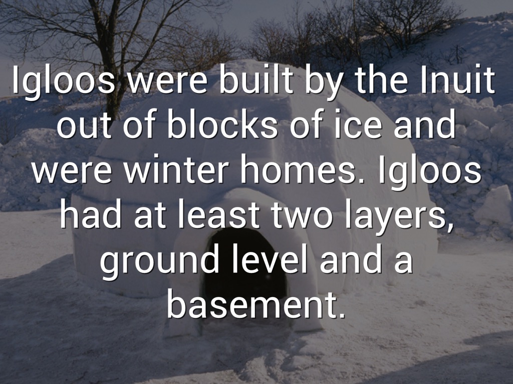 Igloos were built by the Inuit out of blocks of ice and were winter homes. Igloos had at least two layers, ground level and a basement.