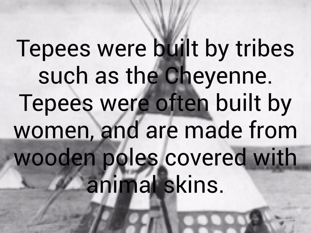 Tepees were built by tribes such as the Cheyenne. Tepees were often built by women, and are made from wooden poles covered with animal skins.