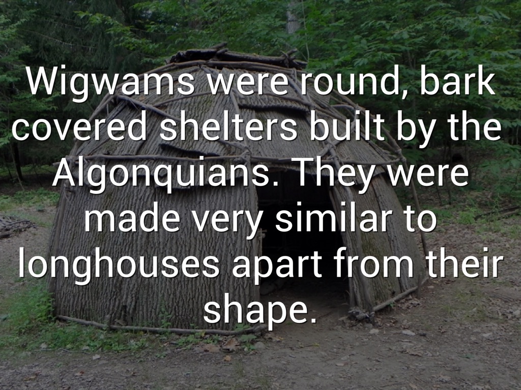Wigwams were round, bark covered shelters built by the Algonquians. They were made very similar to longhouses apart from their shape.
