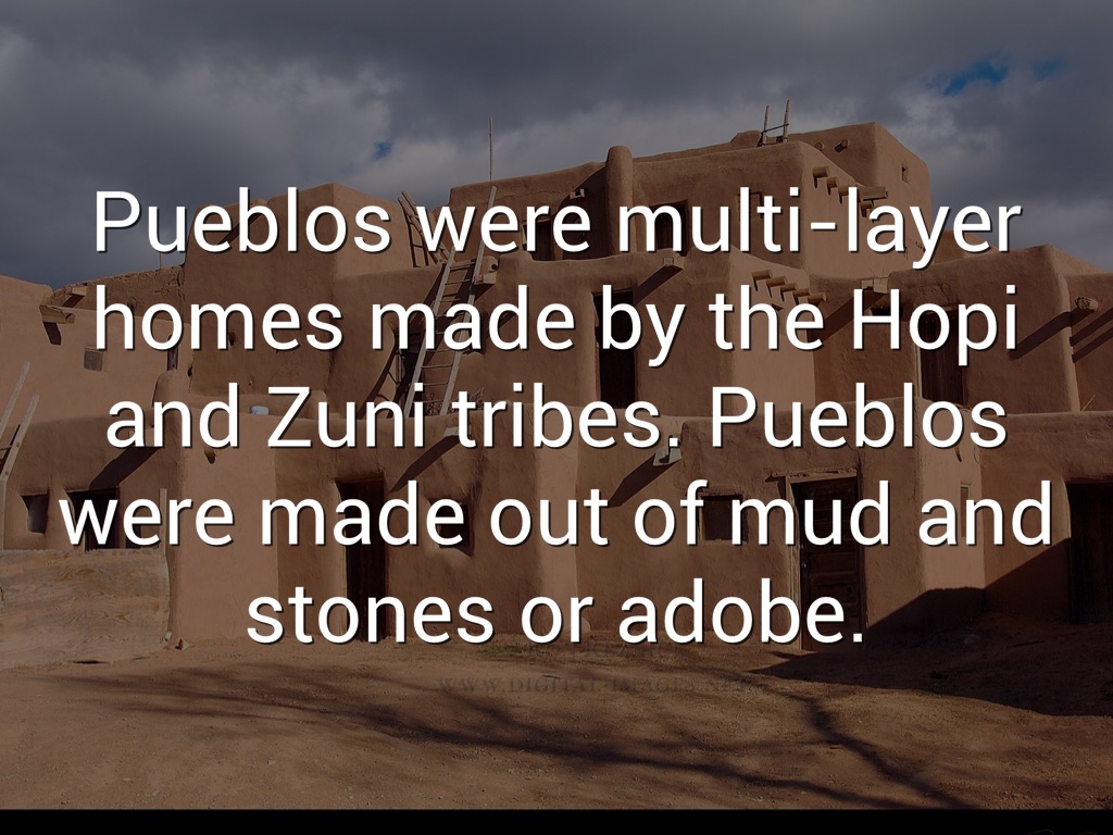 Pueblos were multi-layer homes made by the Hopi and Zuni tribes. Pueblos were made out of mud and stones or adobe.