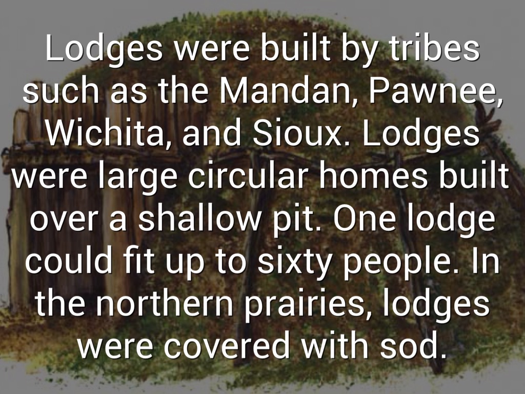 Lodges were built by tribes such as the Mandan, Pawnee, Wichita, and Sioux. Lodges were large circular homes built over a shallow pit. One lodge could fit up to sixty people. In the northern prairies, lodges were covered with sod.