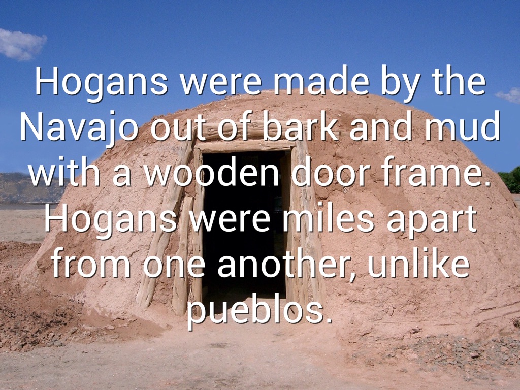 Hogans were made by the Navajo out of bark and mud with a wooden door frame. Hogans were miles apart from one another, unlike pueblos.