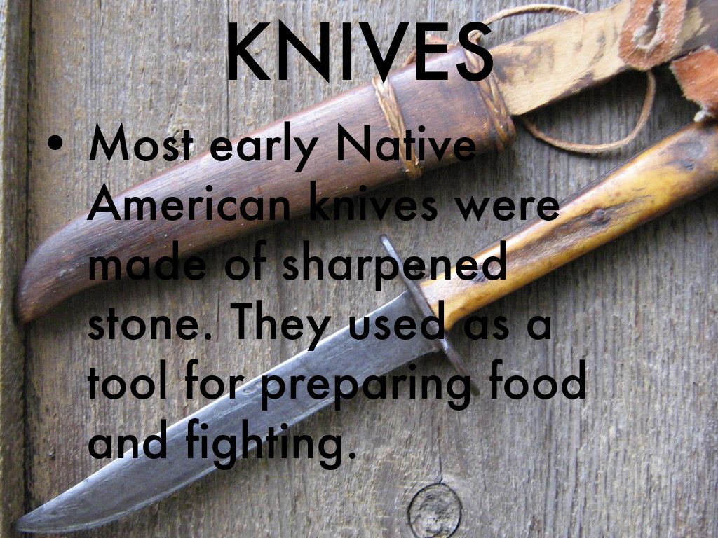 Most early Native American knives were made of sharpened stone. They used as a tool for preparing food and fighting.
