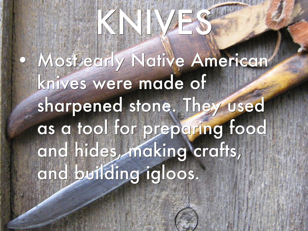Most early Native American knives were made of sharpened stone. They used as a tool for preparing food and hides, making crafts, and building igloos.