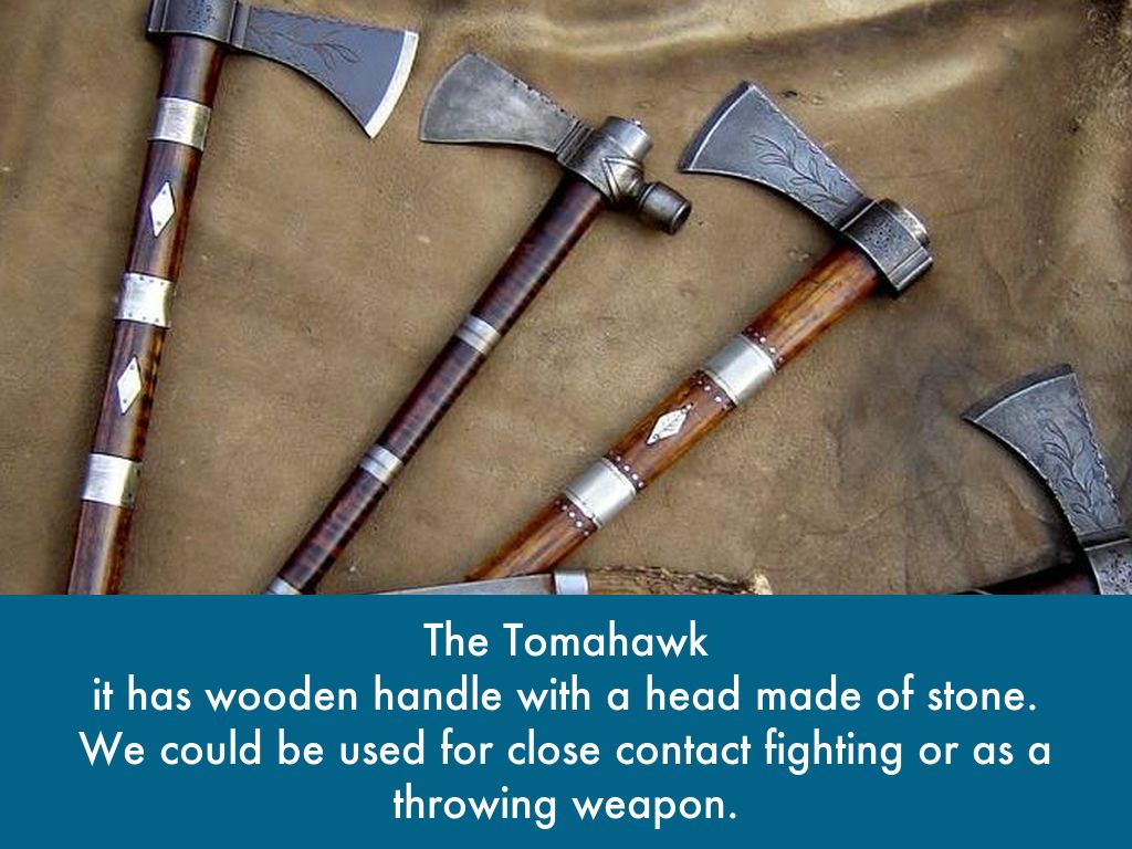 it has wooden handle with a head made of stone. We could be used for close contact fighting or as a throwing weapon.