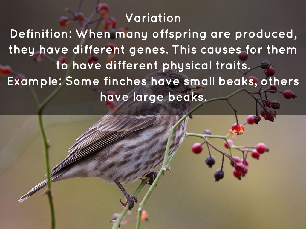 Definition: When many offspring are produced, they have different genes. This causes for them to have different physical traits.