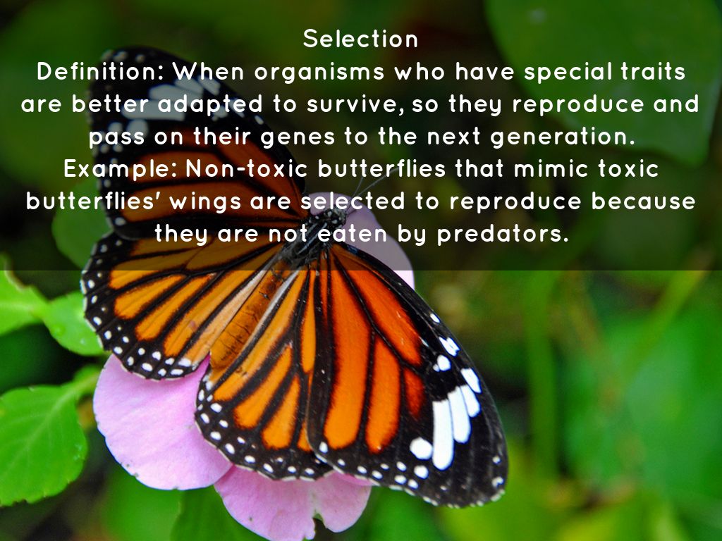 Example: Non-toxic butterflies that mimic toxic butterflies' wings are selected to reproduce because they are not eaten by predators.