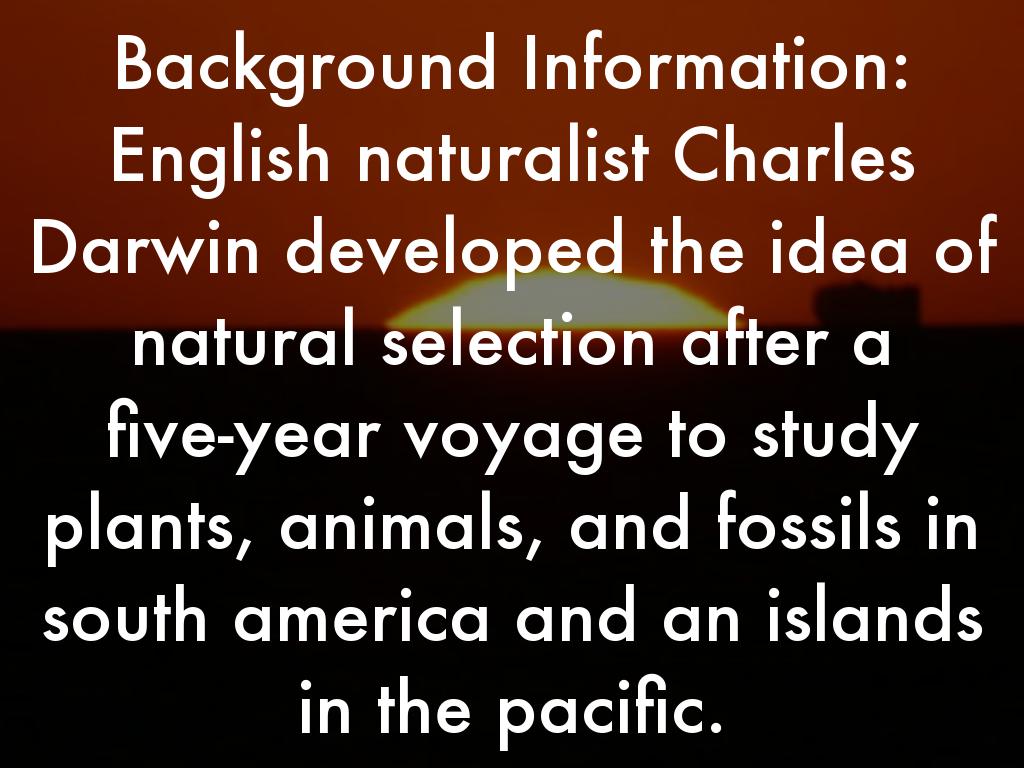Background Information: English naturalist Charles Darwin developed the idea of natural selection after a five-year voyage to study plants, animals, and fossils in south america and an islands in the pacific.