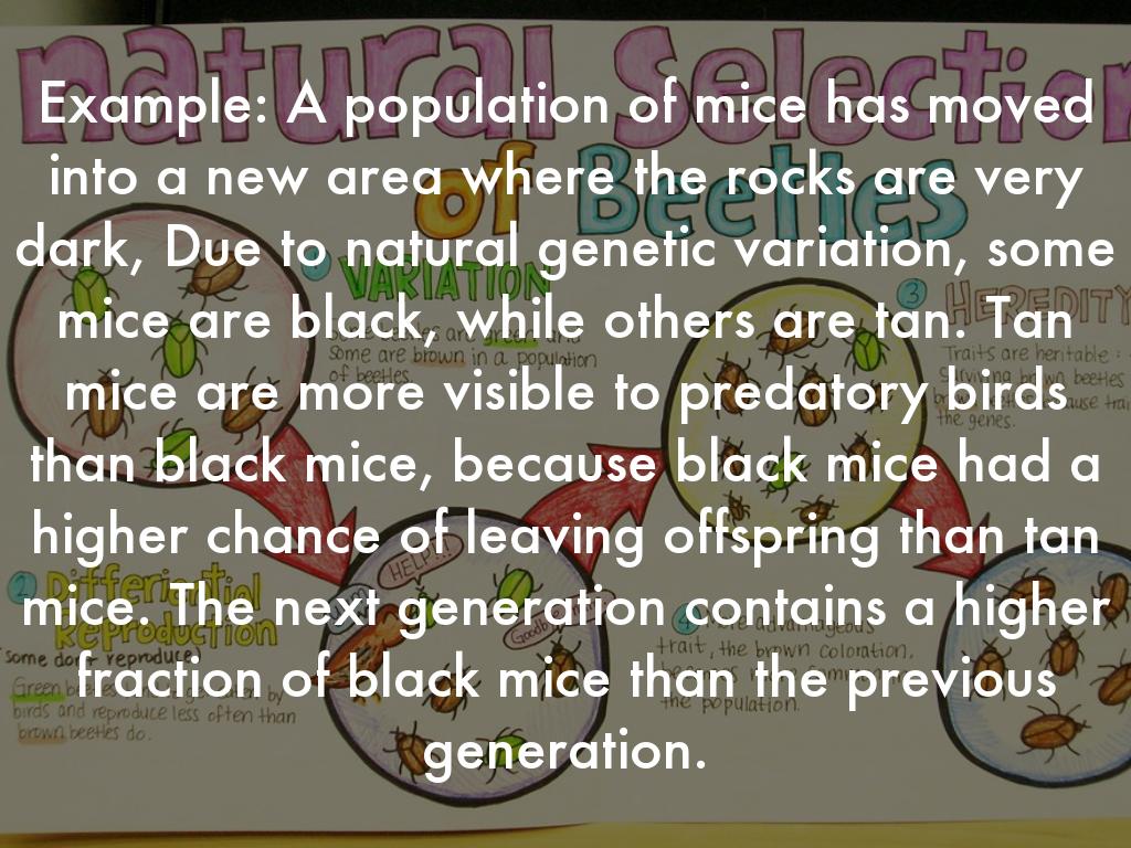 Example: A population of mice has moved into a new area where the rocks are very dark, Due to natural genetic variation, some mice are black, while others are tan. Tan mice are more visible to predatory birds than black mice, because black mice had a higher chance of leaving offspring than tan mice. The next generation contains a higher fraction of black mice than the previous generation.