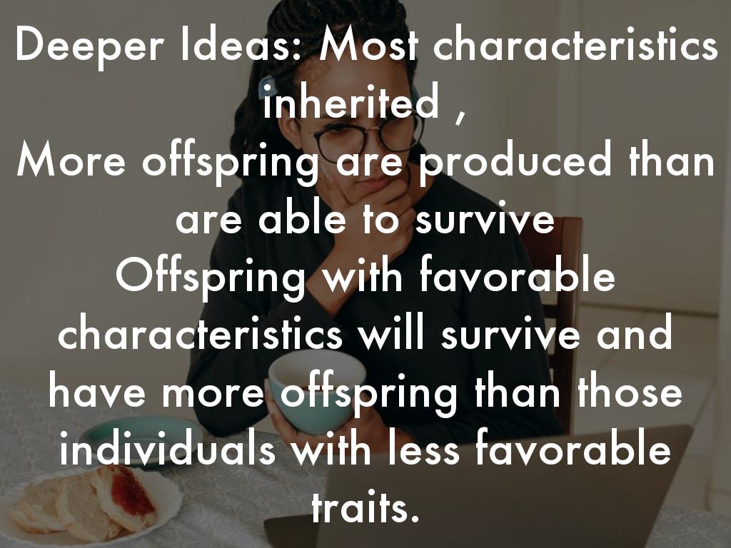 Deeper Ideas: Most characteristics inherited , More offspring are produced than are able to survive Offspring with favorable characteristics will survive and have more offspring than those individuals with less favorable traits.