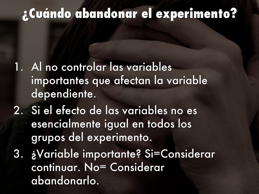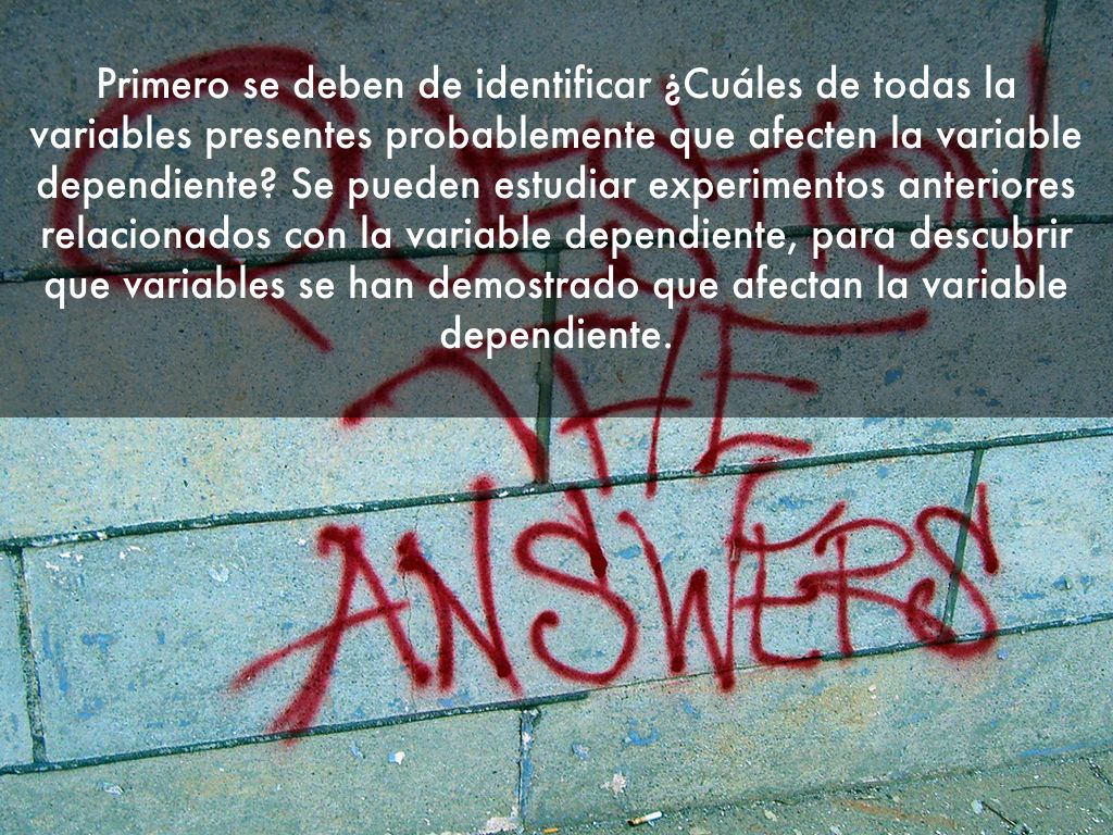 Primero se deben de identificar ¿Cuáles de todas la variables presentes probablemente que afecten la variable dependiente? Se pueden estudiar experimentos anteriores relacionados con la variable dependiente, para descubrir que variables se han demostrado que afectan la variable dependiente.