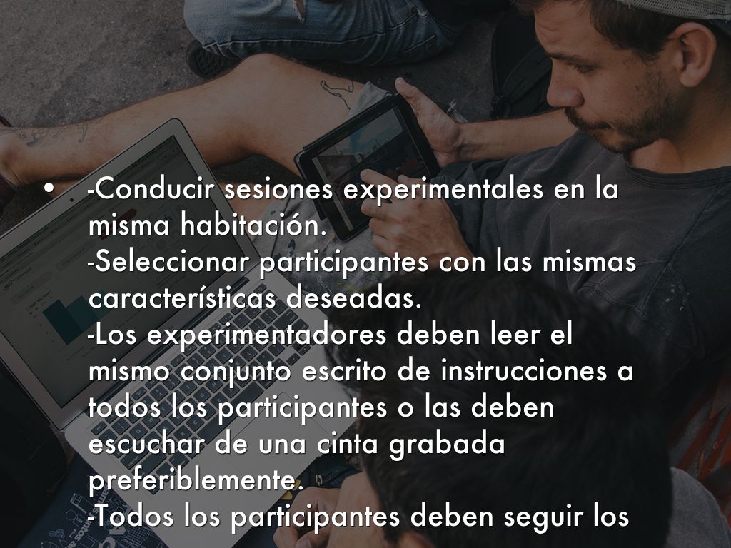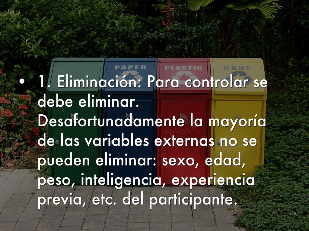 1. Eliminación: Para controlar se debe eliminar. Desafortunadamente la mayoría de las variables externas no se pueden eliminar: sexo, edad, peso, inteligencia, experiencia previa, etc. del participante.