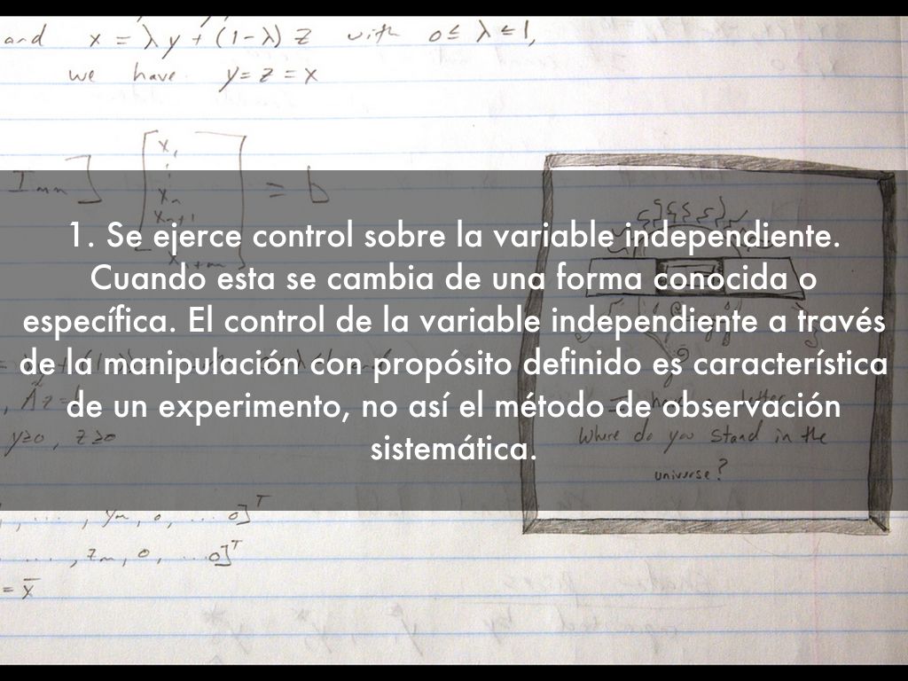 1. Se ejerce control sobre la variable independiente. Cuando esta se cambia de una forma conocida o específica. El control de la variable independiente a través de la manipulación con propósito definido es característica de un experimento, no así el método de observación sistemática.