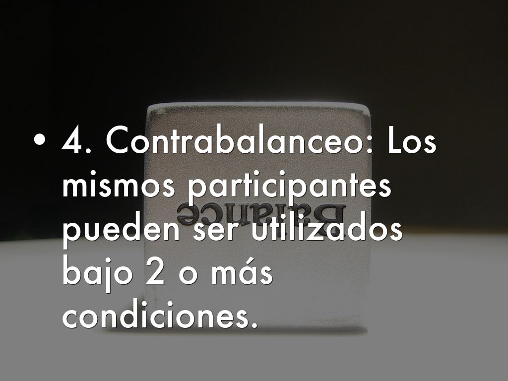 3. Balanceo: Cuando no es conveniente o posible mantener condiciones constantes en el experimento, se pueden balancear los efectos de las variables externas.