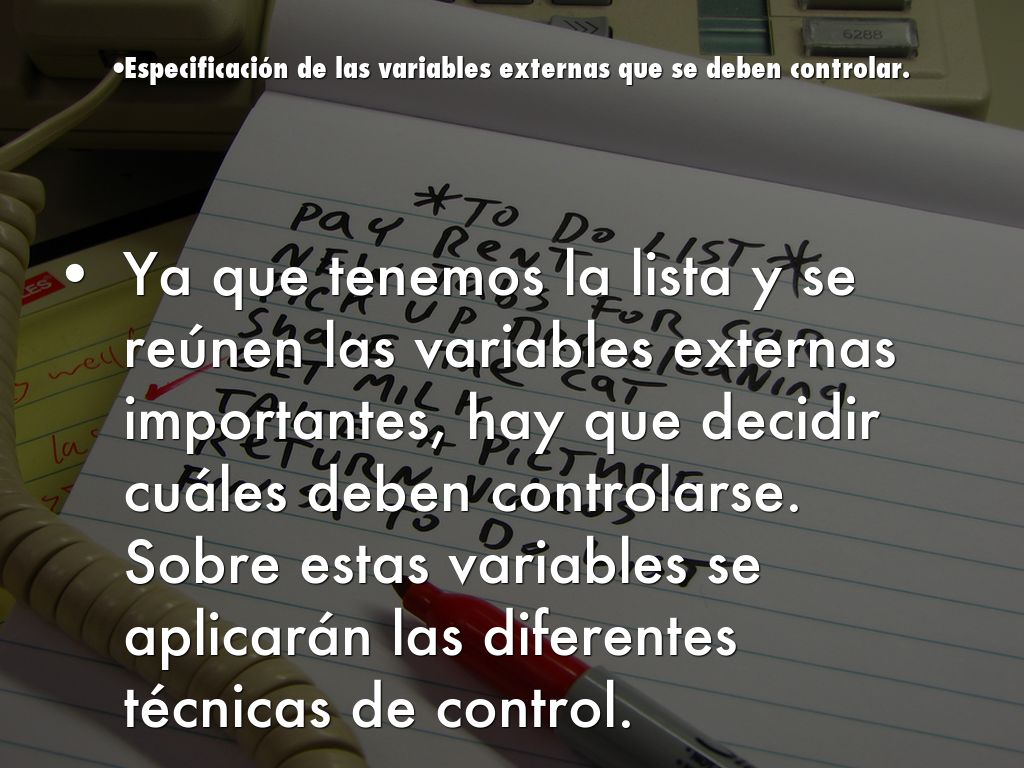 Ya que tenemos la lista y se reúnen las variables externas importantes, hay que decidir cuáles deben controlarse. Sobre estas variables se aplicarán las diferentes técnicas de control.