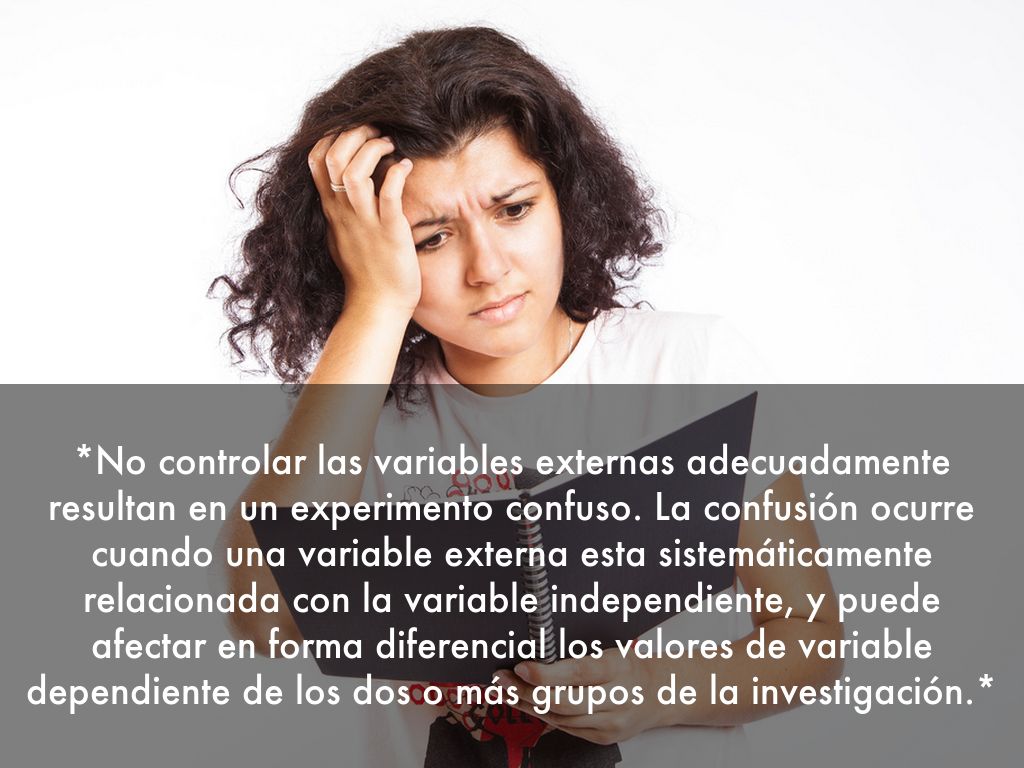 *No controlar las variables externas adecuadamente resultan en un experimento confuso. La confusión ocurre cuando una variable externa esta sistemáticamente relacionada con la variable independiente, y puede afectar en forma diferencial los valores de variable dependiente de los dos o más grupos de la investigación.*