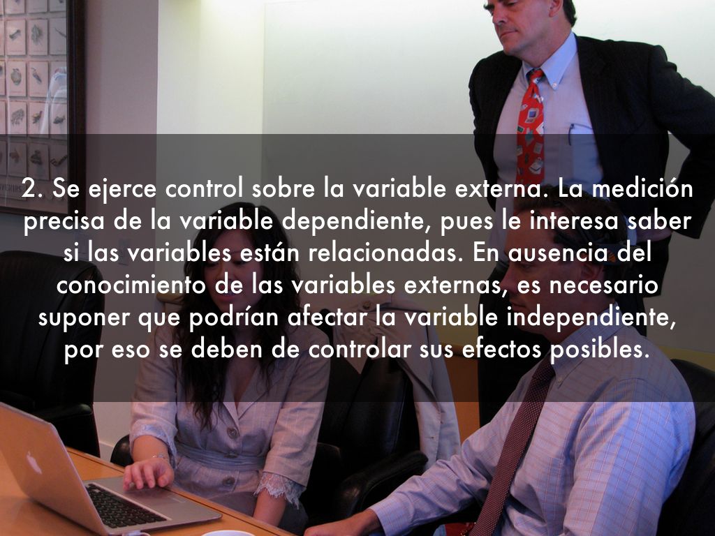 2. Se ejerce control sobre la variable externa. La medición precisa de la variable dependiente, pues le interesa saber si las variables están relacionadas. En ausencia del conocimiento de las variables externas, es necesario suponer que podrían afectar la variable independiente, por eso se deben de controlar sus efectos posibles.