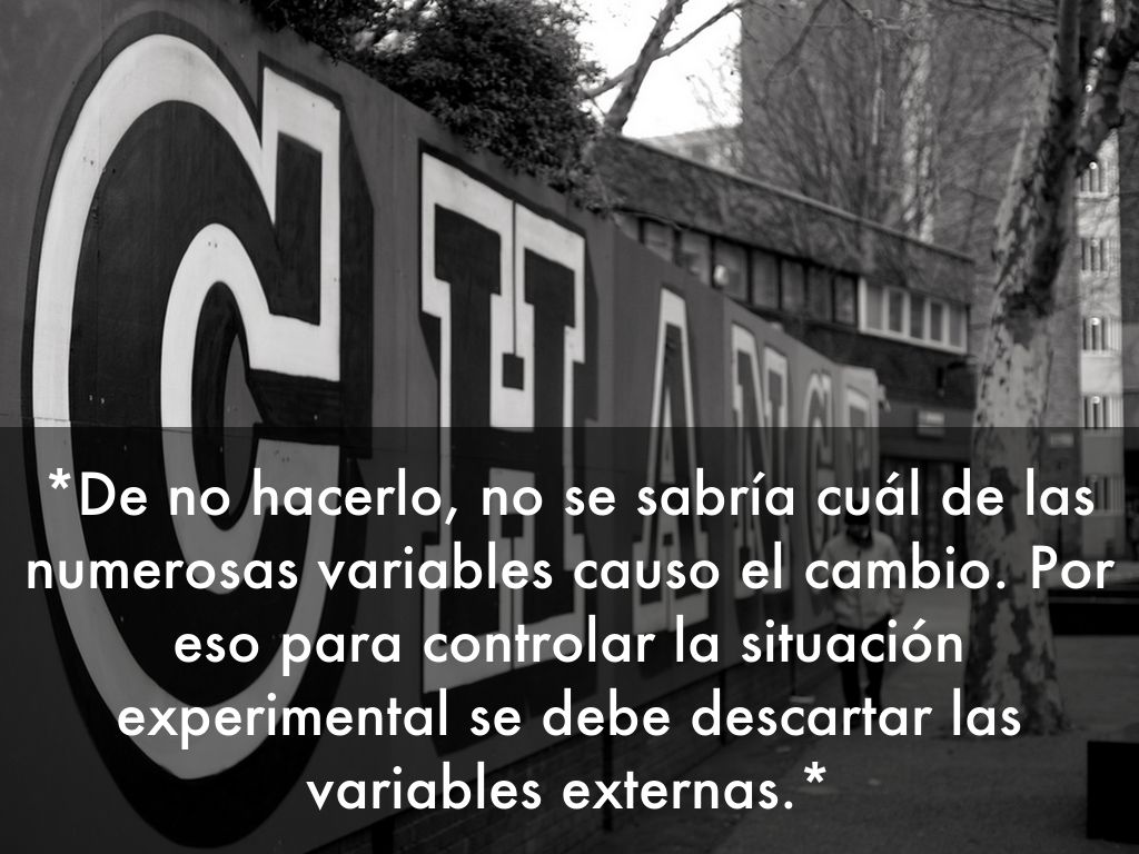 *De no hacerlo, no se sabría cuál de las numerosas variables causo el cambio. Por eso para controlar la situación experimental se debe descartar las variables externas.*