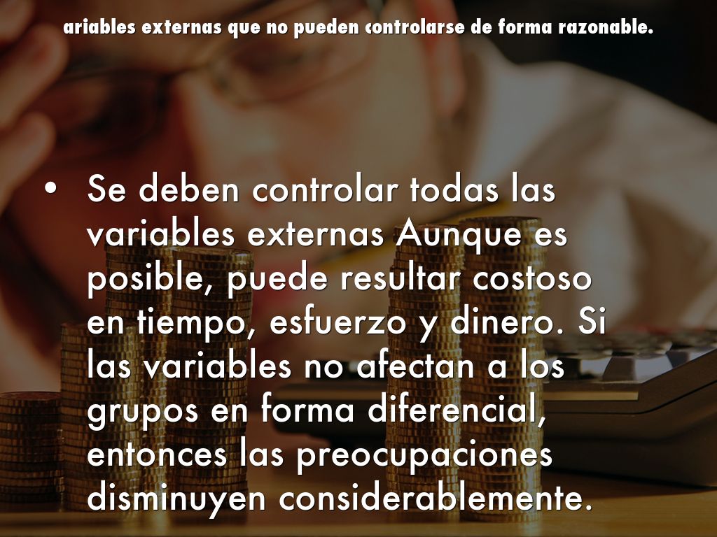 Se deben controlar todas las variables externas Aunque es posible, puede resultar costoso en tiempo, esfuerzo y dinero. Si las variables no afectan a los grupos en forma diferencial, entonces las preocupaciones disminuyen considerablemente.