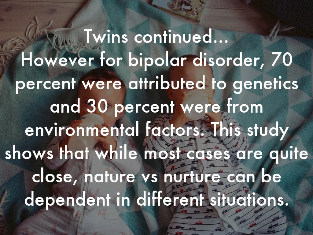 Twins continued... However for bipolar disorder, 70 percent were attributed to genetics and 30 percent were from environmental factors. This study shows that while most cases are quite close, nature vs nurture can be dependent in different situations.