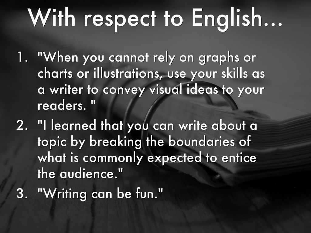 - "I learned that you can write about a topic by breaking the boundaries of what is commonly expected to entice the audience."