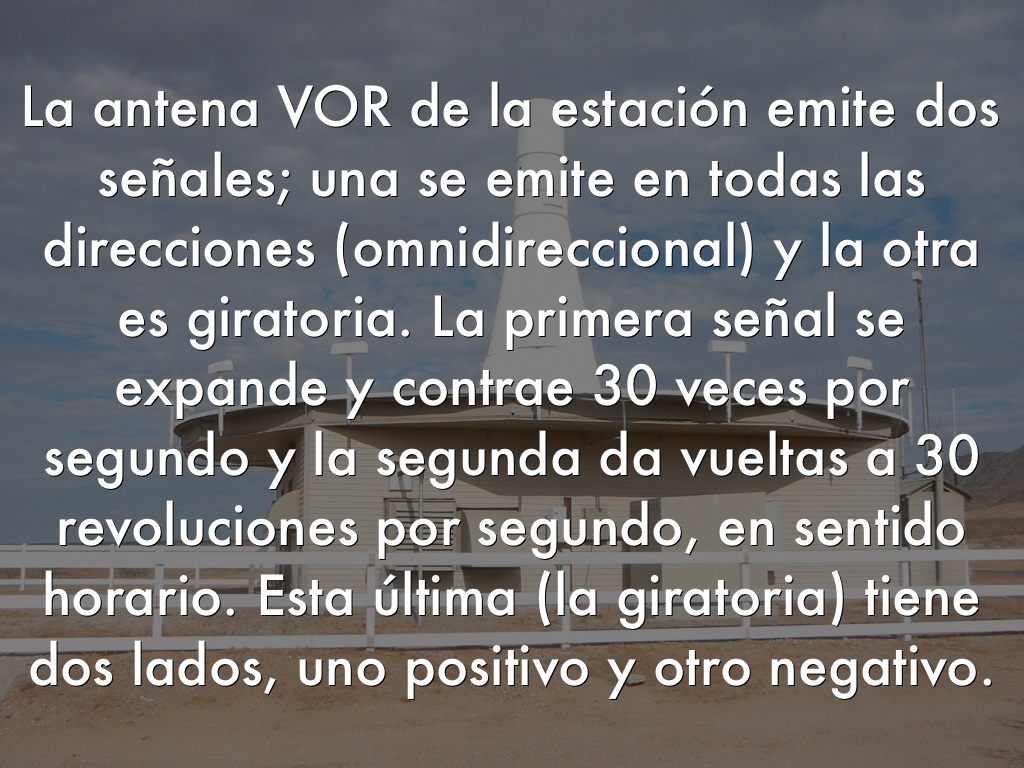 La antena VOR de la estación emite dos señales; una se emite en todas las direcciones (omnidireccional) y la otra es giratoria. La primera señal se expande y contrae 30 veces por segundo y la segunda da vueltas a 30 revoluciones por segundo, en sentido horario. Esta última (la giratoria) tiene dos lados, uno positivo y otro negativo.