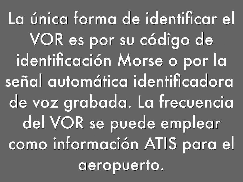 La única forma de identificar el VOR es por su código de identificación Morse o por la señal automática identificadora de voz grabada. La frecuencia del VOR se puede emplear como información ATIS para el aeropuerto.