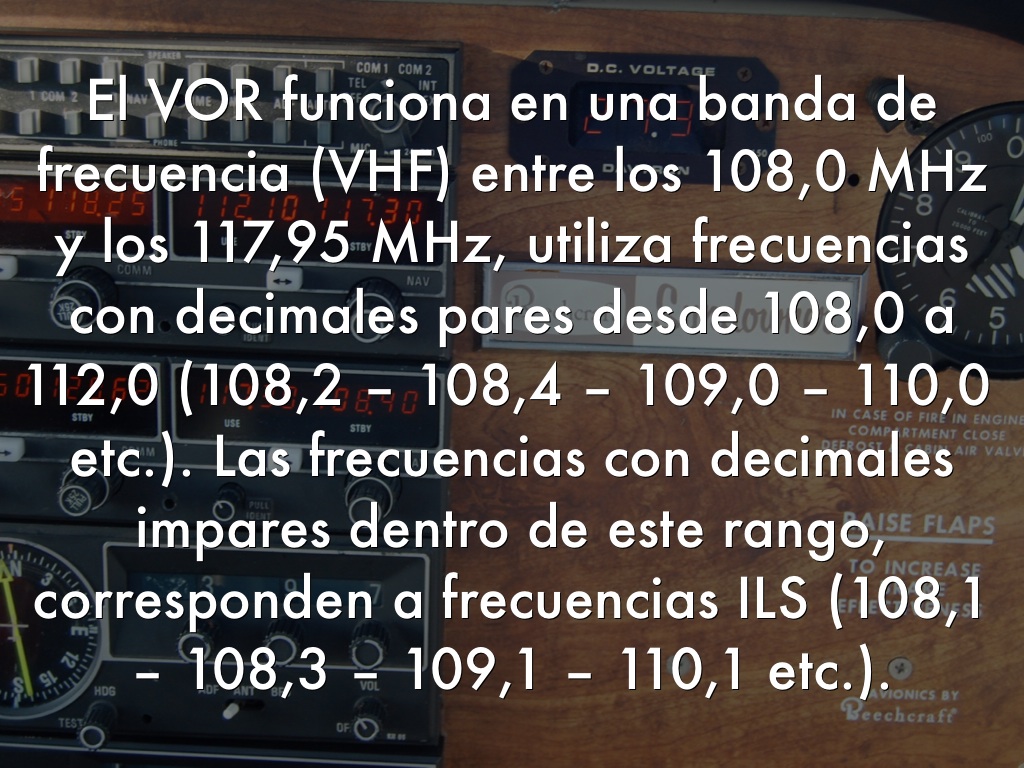 El VOR funciona en una banda de frecuencia (VHF) entre los 108,0 MHz y los 117,95 MHz, utiliza frecuencias con decimales pares desde 108,0 a 112,0 (108,2 – 108,4 – 109,0 – 110,0 etc.). Las frecuencias con decimales impares dentro de este rango, corresponden a frecuencias ILS (108,1 – 108,3 – 109,1 – 110,1 etc.).
