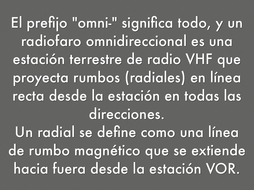 El prefijo "omni-" significa todo, y un radiofaro omnidireccional es una estación terrestre de radio VHF que proyecta rumbos (radiales) en línea recta desde la estación en todas las direcciones.