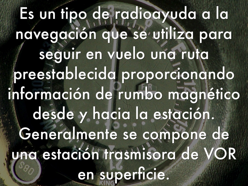 Es un tipo de radioayuda a la navegación que se utiliza para seguir en vuelo una ruta preestablecida proporcionando información de rumbo magnético desde y hacia la estación. Generalmente se compone de una estación trasmisora de VOR en superficie.