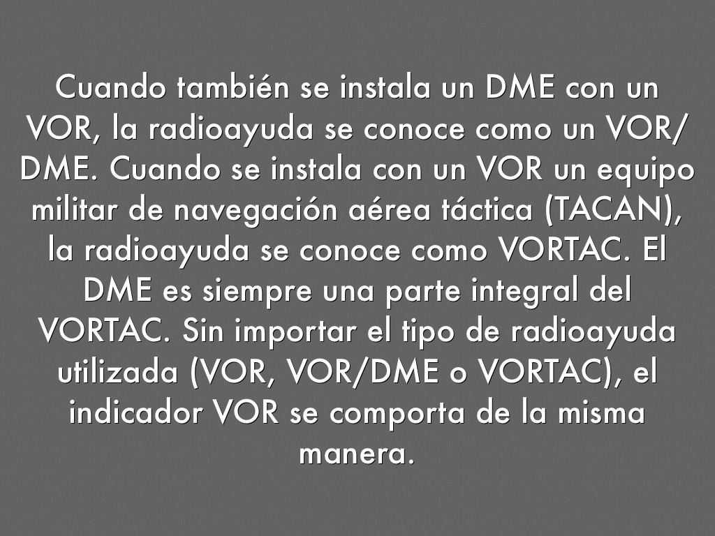Cuando también se instala un DME con un VOR, la radioayuda se conoce como un VOR/DME. Cuando se instala con un VOR un equipo militar de navegación aérea táctica (TACAN), la radioayuda se conoce como VORTAC. El DME es siempre una parte integral del VORTAC. Sin importar el tipo de radioayuda utilizada (VOR, VOR/DME o VORTAC), el indicador VOR se comporta de la misma