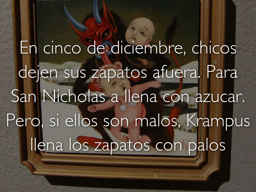 En cinco de diciembre, chicos dejen sus zapatos afuera. Para San Nicholas a llena con azucar. Pero, si ellos son malos, Krampus llena los zapatos con palos