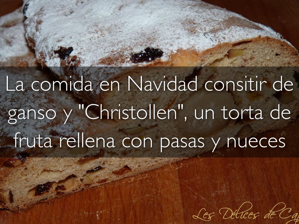 La comida en Navidad consitir de ganso y "Christollen", un torta de fruta rellena con pasas y nueces