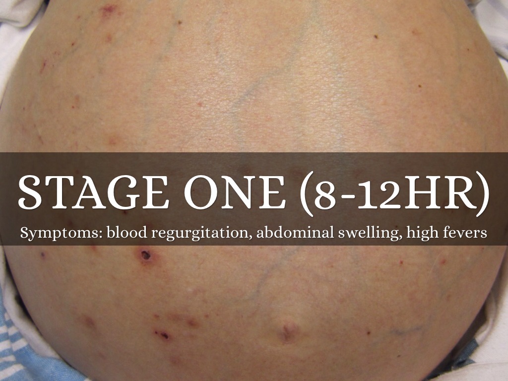 Symptoms: blood regurgitation, abdominal swelling, high fevers