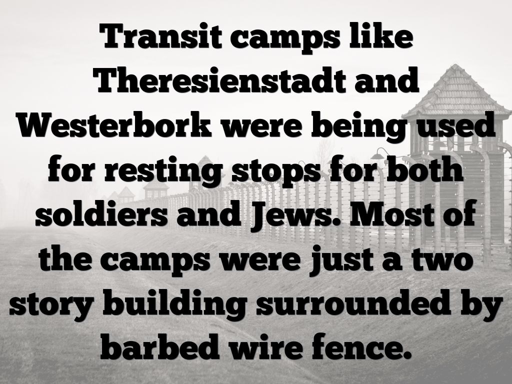 Transit camps like Theresienstadt and Westerbork were being used for resting stops for both soldiers and Jews. Most of the camps were just a two story building surrounded by barbed wire fence.