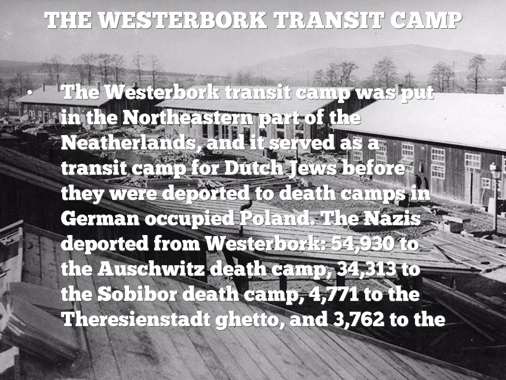 The Westerbork transit camp was put in the Northeastern part of the Neatherlands, and it served as a transit camp for Dutch Jews before they were deported to death camps in German occupied Poland. The Nazis deported from Westerbork: 54,930 to the Auschwitz death camp, 34,313 to the Sobibor death camp, 4,771 to the Theresienstadt ghetto, and 3,762 to the Bergan Belsan concentration camp. Most who were deported to Auschwitz and Sobibor were killed when they arrived.