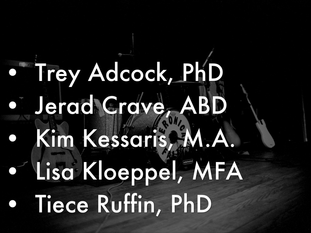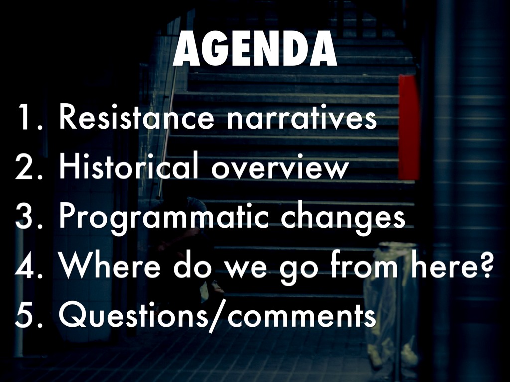 A principal reason why we are grateful to present at NCORE is that is provides a forum for us to share our story at both the diepartment level as well as within in our own individual work. To invite you in and elicit participation we will be using a variety of pedagogical strategies built around resistance narratives. These narratives highlight the voices of faculty and students, both within the department and cross e broader campus, that resist or don't see value in building a healthy, responsible and culturally engaged community of learners.