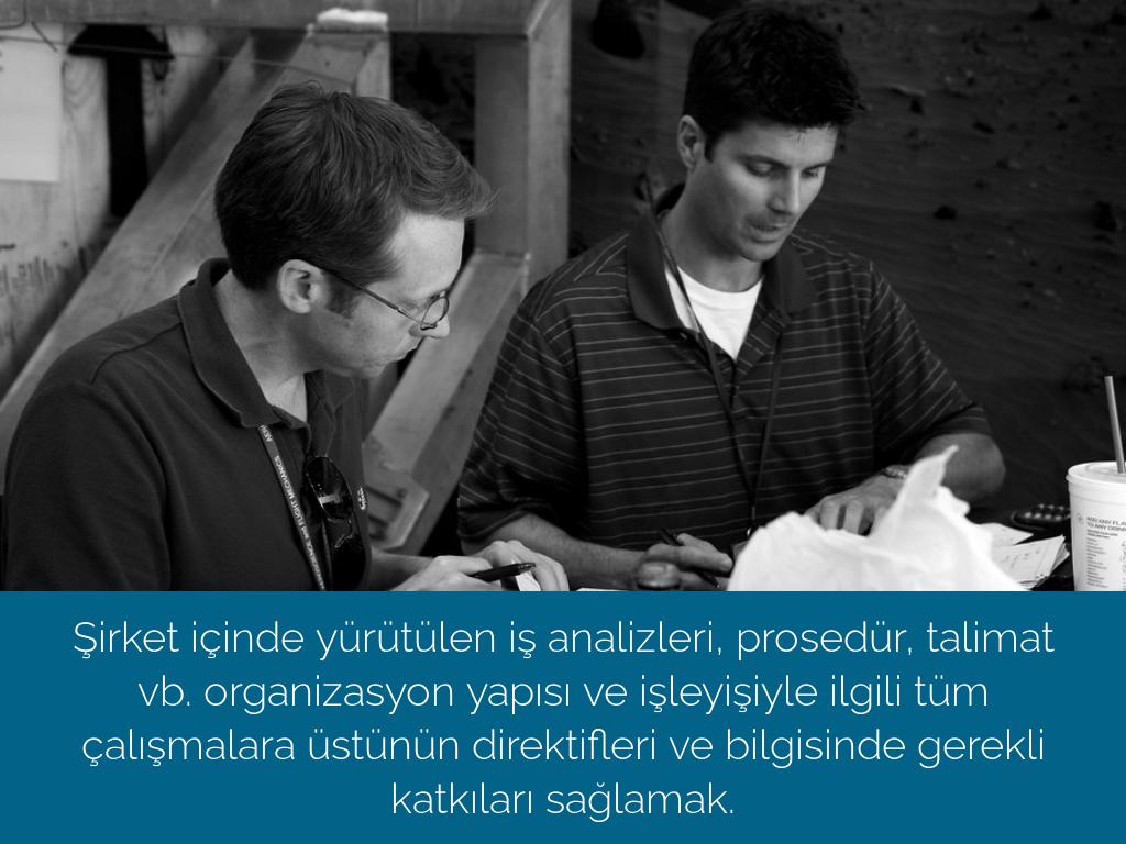 Şirket içinde yürütülen iş analizleri, prosedür, talimat vb. organizasyon yapısı ve işleyişiyle ilgili tüm çalışmalara üstünün direktifleri ve bilgisinde gerekli katkıları sağlamak.