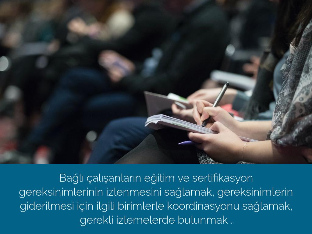 Bağlı çalışanların eğitim ve sertifikasyon gereksinimlerinin izlenmesini sağlamak, gereksinimlerin giderilmesi için ilgili birimlerle koordinasyonu sağlamak, gerekli izlemelerde bulunmak