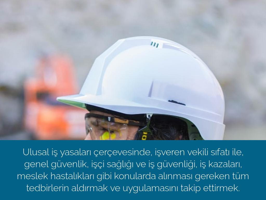 Ulusal iş yasaları çerçevesinde, işveren vekili sıfatı ile, genel güvenlik, işçi sağlığı ve iş güvenliği, iş kazaları, meslek hastalıkları gibi konularda alınması gereken tüm tedbirlerin aldırmak ve uygulamasını takip ettirmek.