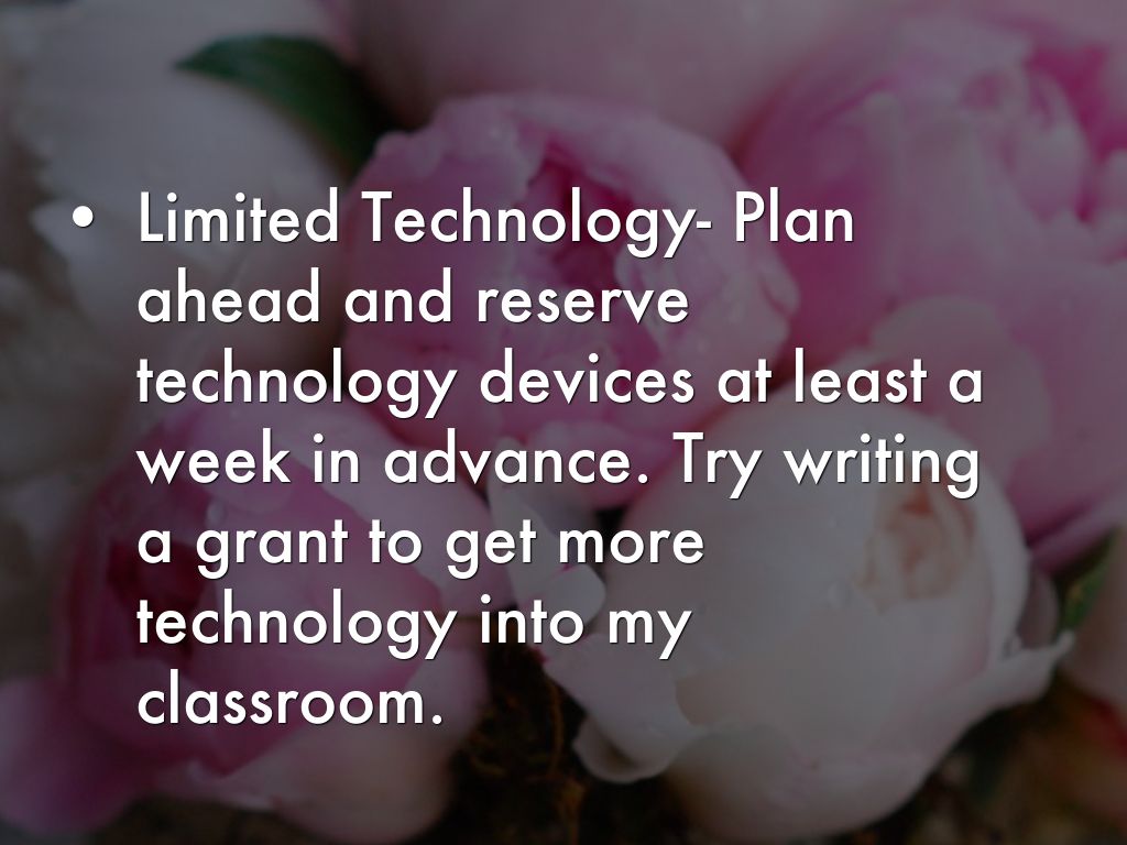 Limited Technology- Plan ahead and reserve technology devices at least a week in advance. Try writing a grant to get more technology into my classroom.
