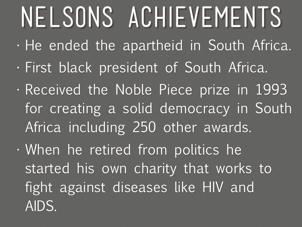 Received the Noble Piece prize in 1993 for creating a solid democracy in South Africa including 250 other awards.