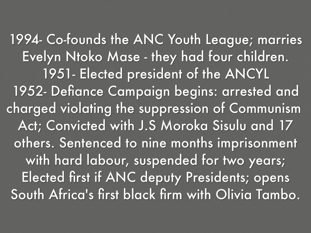1952- Defiance Campaign begins: arrested and charged violating the suppression of Communism Act; Convicted with J.S Moroka Sisulu and 17 others. Sentenced to nine months imprisonment with hard labour, suspended for two years; Elected first if ANC deputy Presidents; opens South Africa's first black firm with Olivia Tambo.