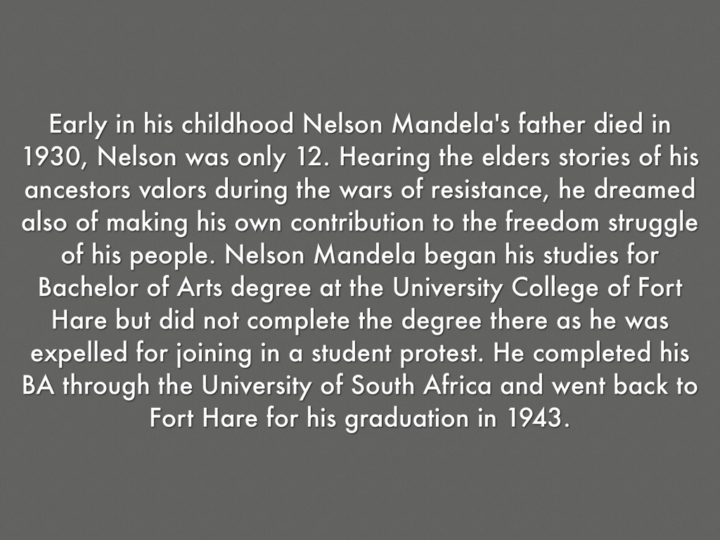 Early in his childhood Nelson Mandela's father died in 1930, Nelson was only 12. Hearing the elders stories of his ancestors valors during the wars of resistance, he dreamed also of making his own contribution to the freedom struggle of his people. Nelson Mandela began his studies for Bachelor of Arts degree at the University College of Fort Hare but did not complete the degree there as he was expelled for joining in a student protest. He completed his BA through the University of South Africa and went back to Fort Hare for his graduation in 1943.