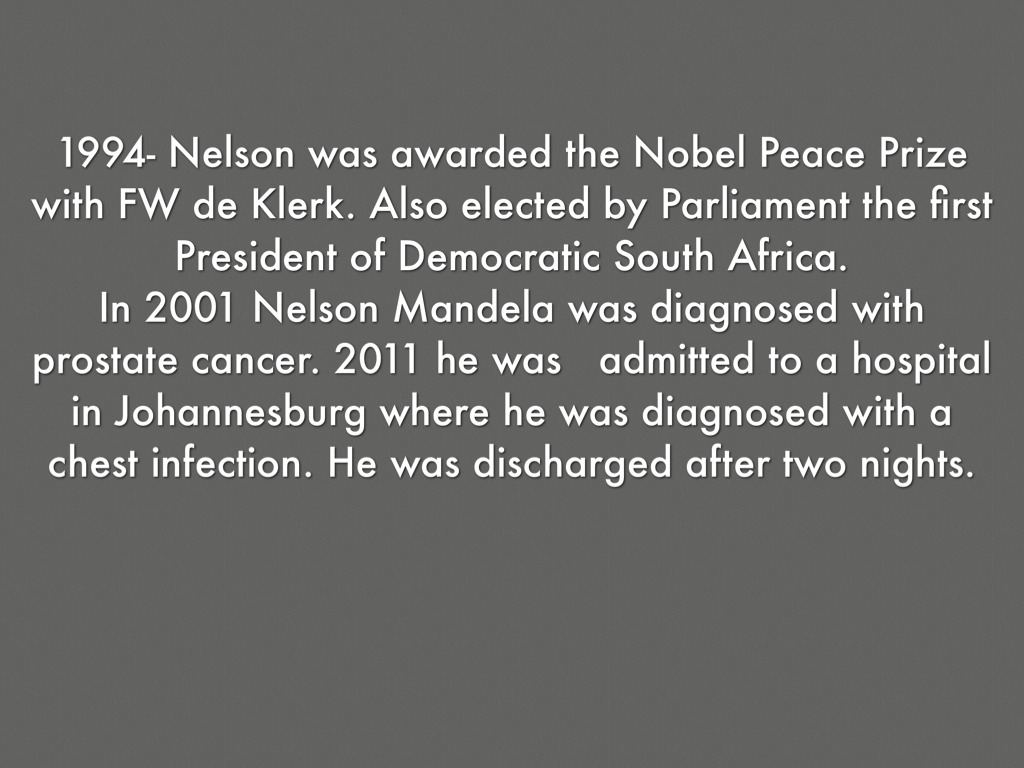 1994- Nelson was awarded the Nobel Peace Prize with FW de Klerk. Also elected by Parliament the first President of Democratic South Africa.