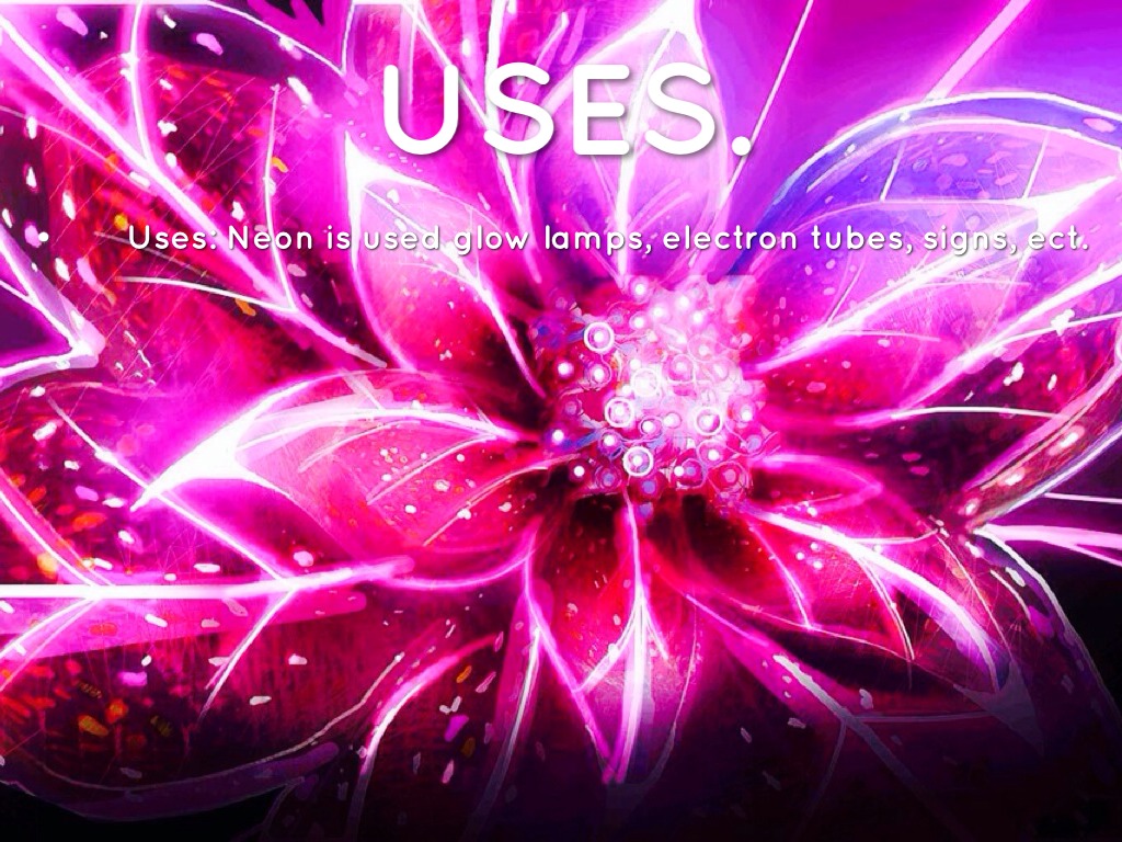 Uses: Neon is used glow lamps, electron tubes, signs, ect.