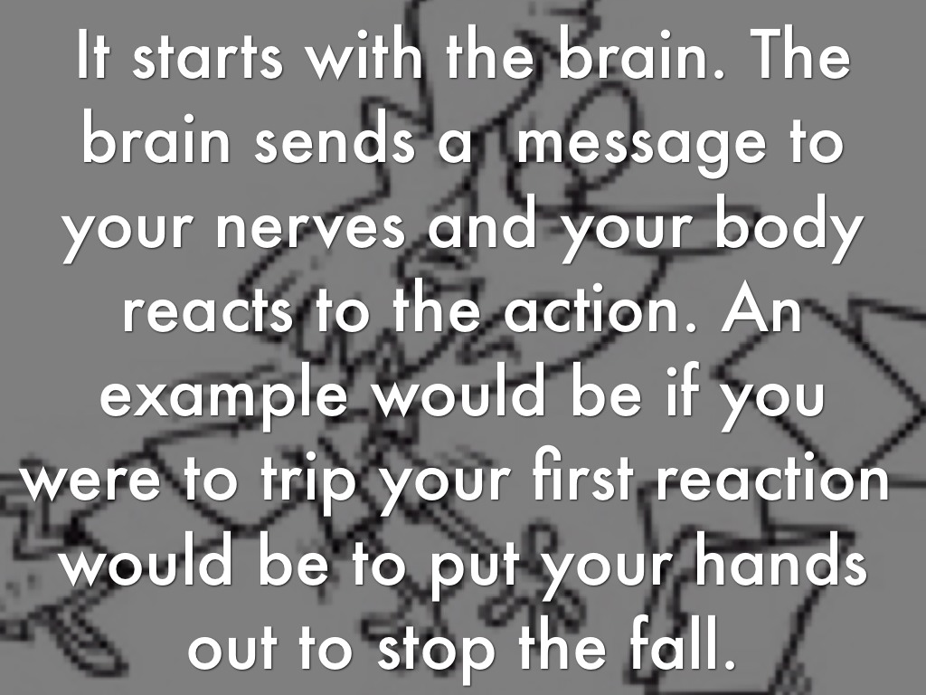 It starts with the brain. The brain sends a message to your nerves and your body reacts to the action. An example would be if you were to trip your first reaction would be to put your hands out to stop the fall.